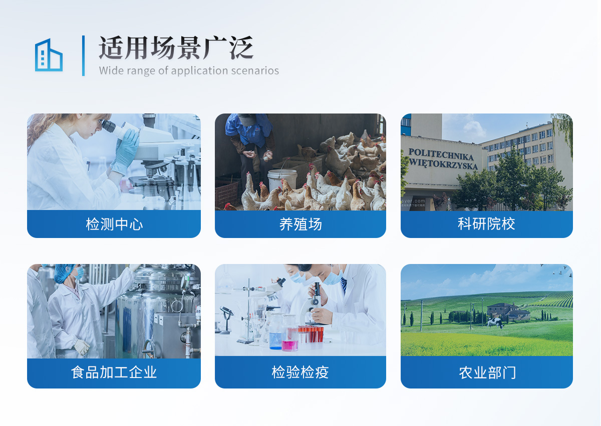 该兽药残留检测仪为集成化食品安全快速检测分析设备,目前已于食药监局、卫生部门、高教院校、科研院所、农业部门、养殖场、屠宰场、食品肉产品深加工企业及检验检疫部门等单位广泛使用。